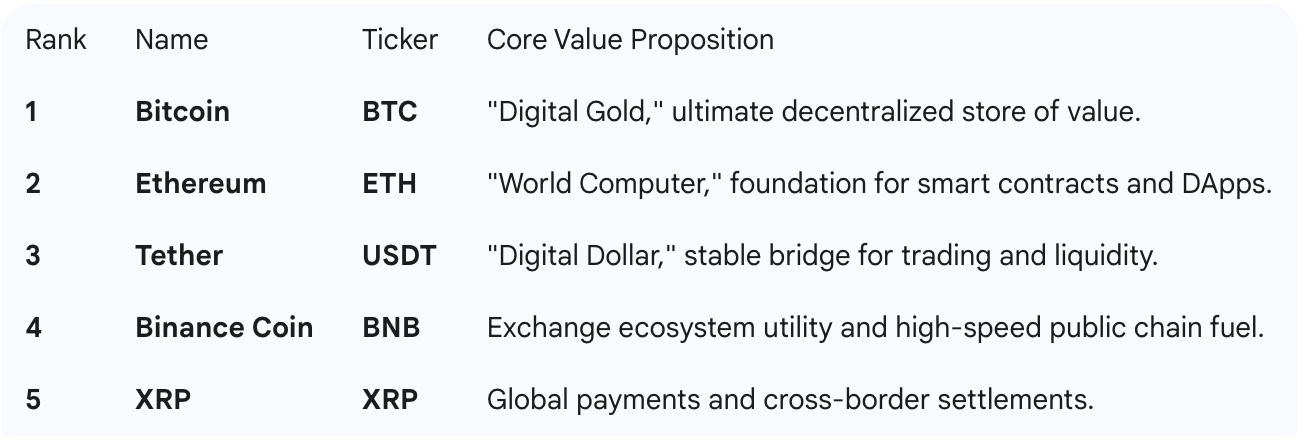 This essential guide for Web3 beginners breaks down the Top 5 cryptocurrencies by market cap—Bitcoin (BTC), Ethereum (ETH), Tether (USDT), Binance Coin (BNB), and XRP—explaining their distinct core value propositions, from digital gold and smart contracts to global payments and stable trading.