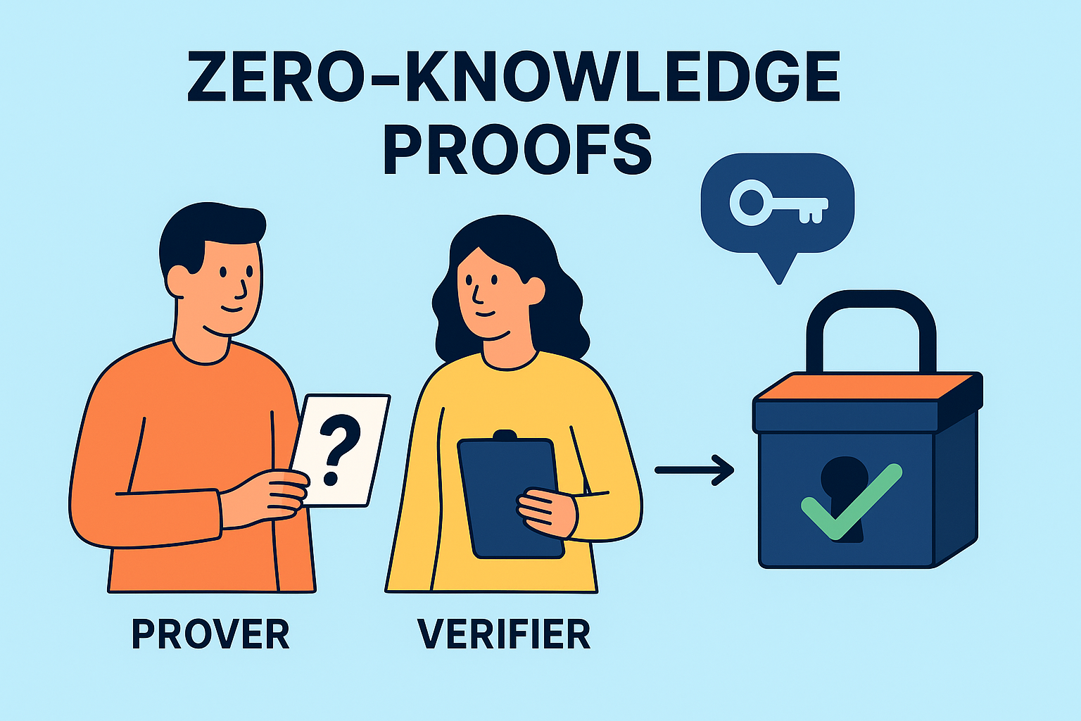 A classic everyday analogy: imagine you want to prove you know the code to a locked box, but you don’t want to show the code. Instead, you put a mark on the inside of the box only someone with the correct code could place. The verifier sees the mark and is convinced you know the code, but never learns the code itself.